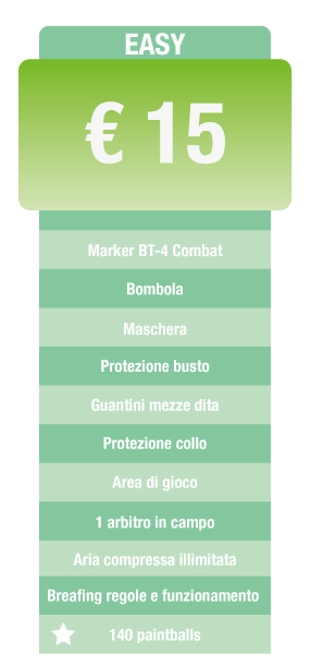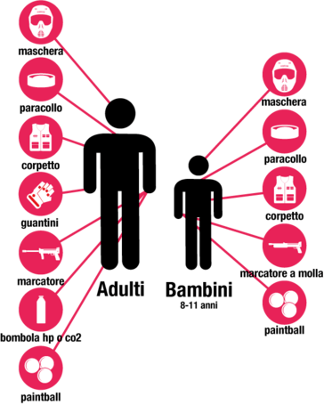 Per giocare a paintball serve spirito di divertimento, una media resistenza fisica per lo sport aerobico e, molto importante, un abbigliamento adeguato: forniamo tutta l'attrezzatura necessaria per giocare in sicurezza e divertirsi!