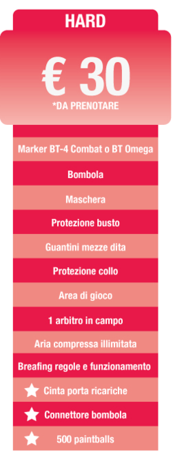 Misurati con una delle varianti più adrenaliniche del Paintball dove la velocità è tutto.Vieni a giocare nel nostro campo di Speedball, qui una serie di bunker gonfiabili disposti nella stessa posizione e presenti nello stesso numero sui due lati del campo creano uno spazio uguale e speculare per ogni squadra partecipante.Obiettivo: eliminazione totale della squadra avversaria in pochi minuti!